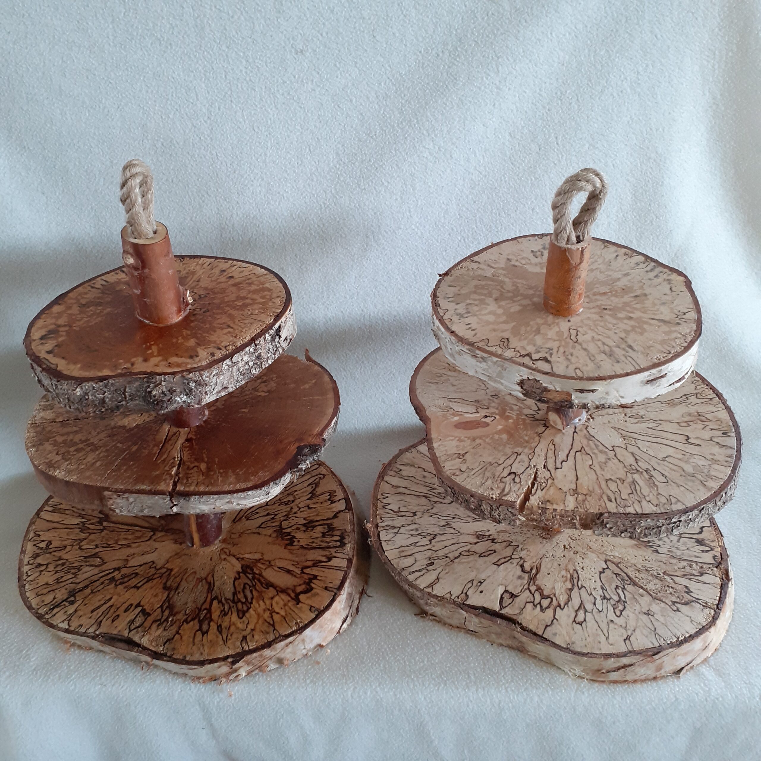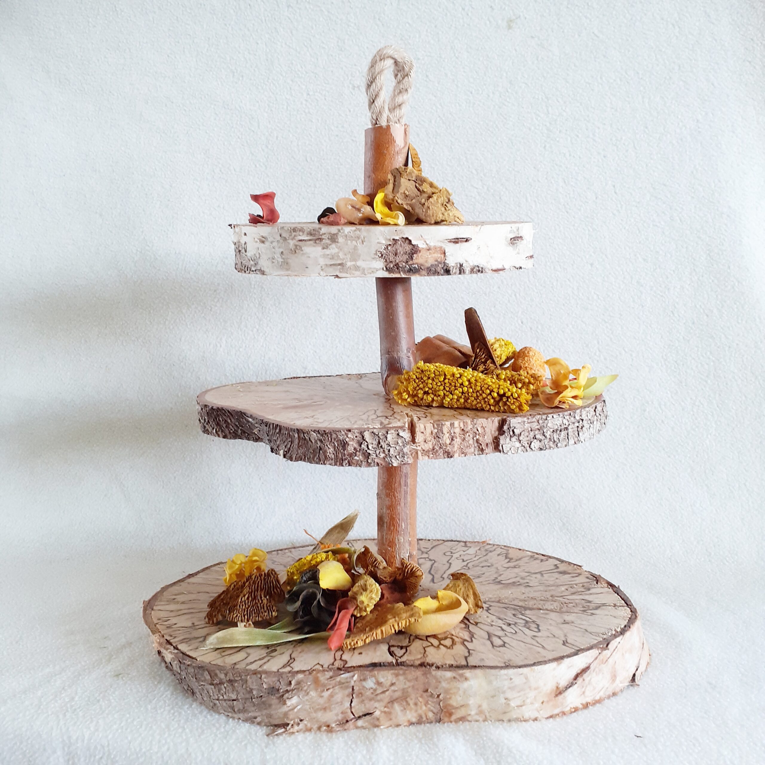 Deze houten etagère is handgemaakt van berkenstammen en helemaal opgebouwd uit natuurlijk materiaal. De bovenkant is afgewerkt met jute touw, wat zijn warme uitstraling extra accentueert. De etagère bestaat uit drie boomstammen, de onderste stam heeft een doorsnede van ongeveer 30 cm, de tweede stam heeft een doorsnede van ongeveer 24 cm, de bovenste stam heeft een doorsnede van ongeveer 18 cm. De totale hoogte van de houten etagère is ongeveer 35 cm. Deze etagère is echt uniek en er is er geen één hetzelfde! Jij kunt deze boomstam etagère kopen en laten shinen in jouw huis!