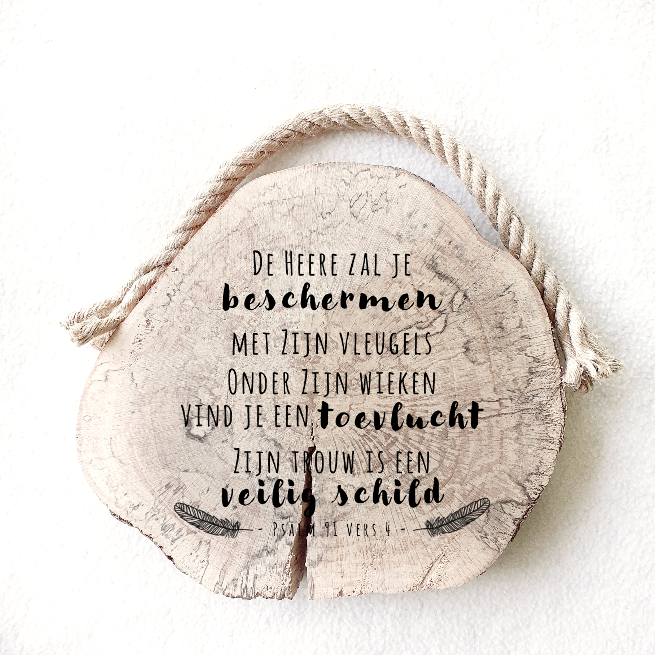 Dit houten tekstbord is gemaakt van boomstamhout. Dit hout komt van bomen uit Nederland, die gesnoeid of gekapt moesten worden wegens ziekte of gevaar voor de omgeving. De doorsnede is ongeveer 15 cm, en je kunt hem mooi ophangen aan het jute touw.