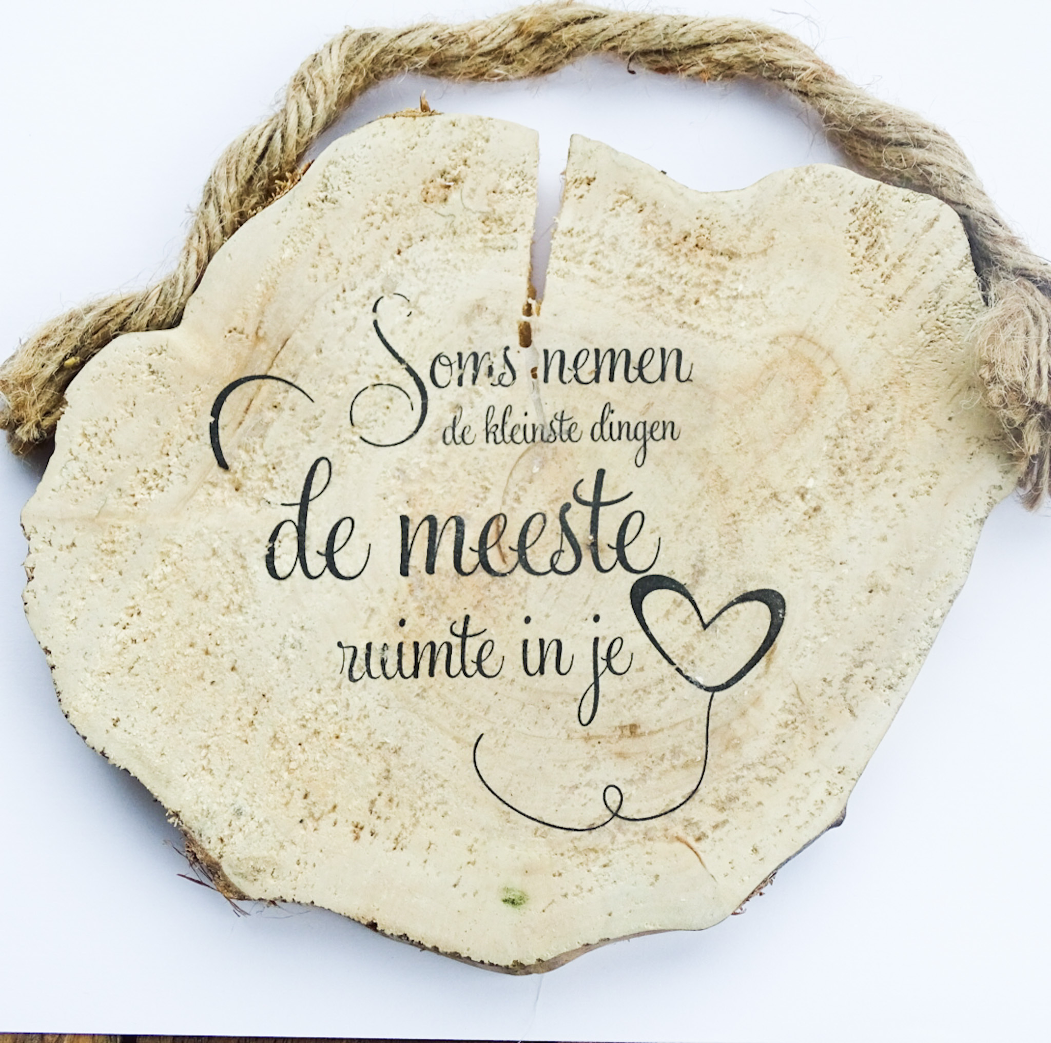 Dit houten tekstbord is gemaakt van boomstamhout. Dit hout komt van bomen uit Nederland, die gesnoeid of gekapt moesten worden wegens ziekte of gevaar voor de omgeving. De doorsnede is ongeveer 15 cm, en je kunt hem mooi ophangen aan het jute touw.